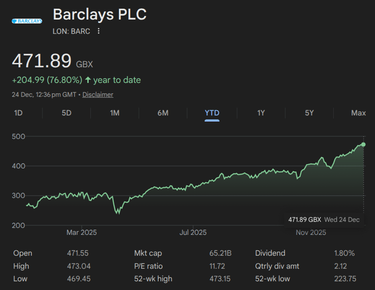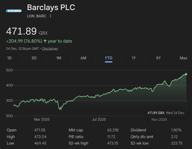 I struggled with this section, for three reasons. One, I don't really view this property as an investment. Two, I probably shouldn't qualify this as a personal finance success either because that suggests that I've made money. Three, I've had some stocks which did well for me (unexpectedly so); never in my wildest dreams would I have expected Barclays to be up more than 75% year to date.