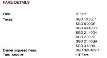 As seen below, I paid a total of SGD 324.40 in award redemption fees (YR) for a one way flight to Sao Paulo from Singapore.