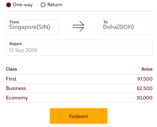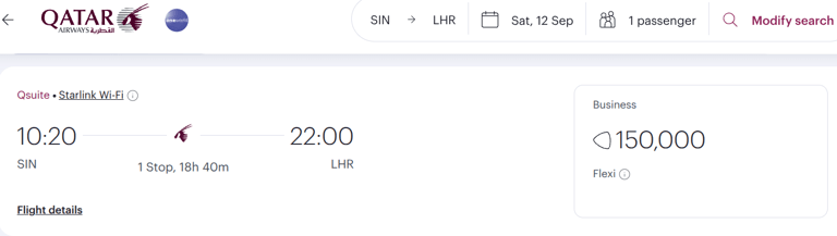 However, Singapore to Doha on 12 September 2026 will now set you back 62500 miles instead of 50000 miles previously, because the flight award is a Regular (Peak) award.