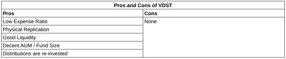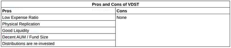 VDST offers the cheapest access to US Treasury bills. If you need a place to park US dollars safely and reliably, VDST is the way to go.
