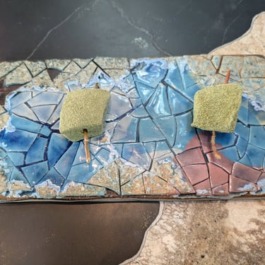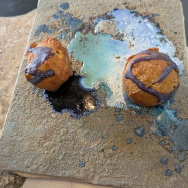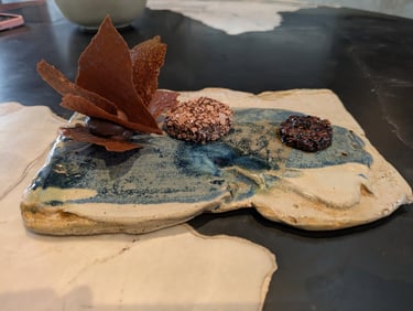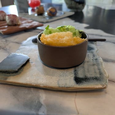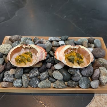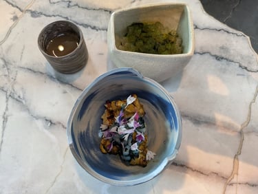 The first course was 'Black Rocks'. The dishes are all made from various types of seaweed, including the doughnut-looking dish. The doughnut doesn't have much taste to it, but the sauces that accompanied it were tasty. The crab was good, but it did not taste anything like crab roe.