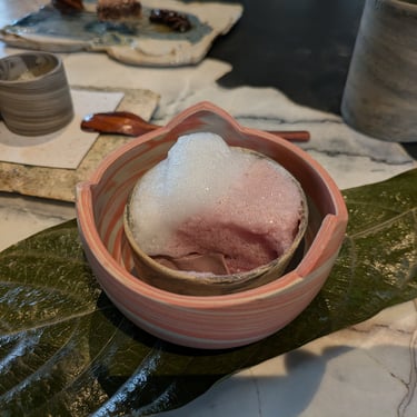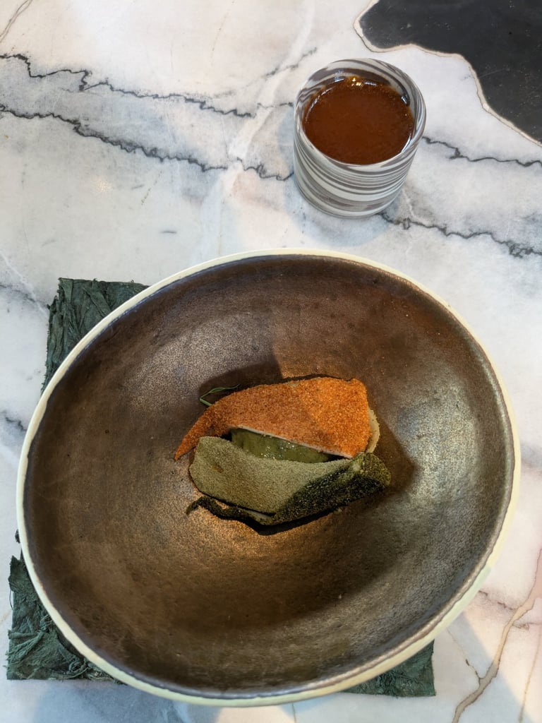 'Warm sea current' was served next, this was probably the best course. It felt like I was hit by a gush of sea breeze as the course was served. The course consists of yellow marinated lobster, paired with a side of cured grouper, and some grouper broth. The lobster was great, with a charred taste but not overcooked. The broth was excellent, warm, and just a little spicy which provided a nice contrast to the lobster.