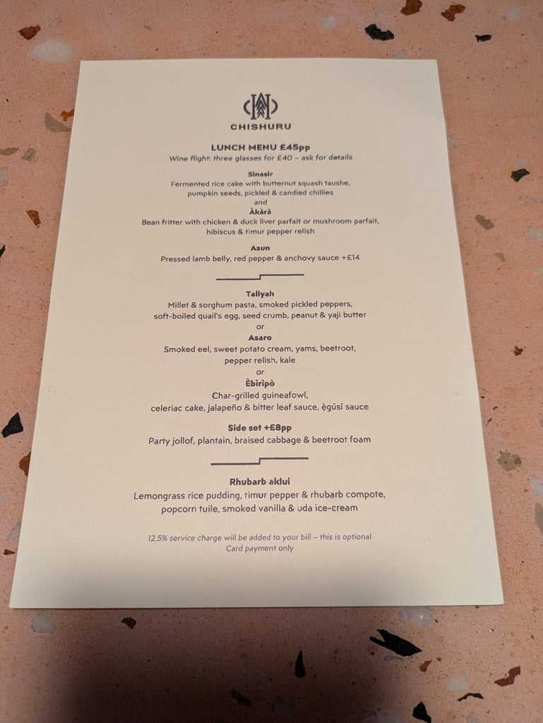 I went to Chishuru for lunch, which costs 45 pounds for a three course meal, and complemented that with some sides for an additional 8 pounds.