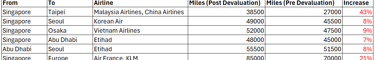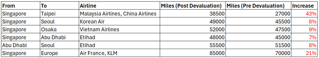 Outside of Europe, the award rates to Seoul or Abu Dhabi from Singapore are still pretty competitive, assuming that you are happy flying on Korean Air, and Etihad respectively.