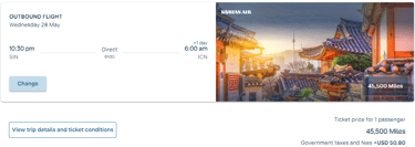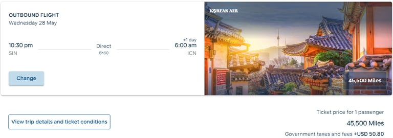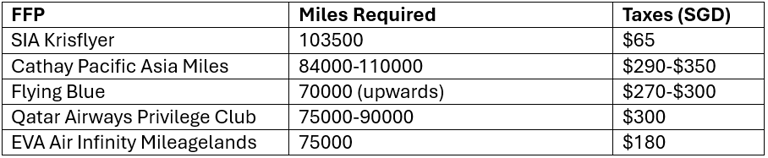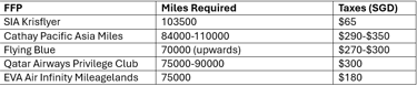 Take Seoul for example, Flying Blue will only charge you 45500 miles and approximately 65SGD in taxes and surcharges for a business class seat on Korean Air.