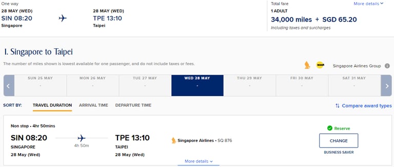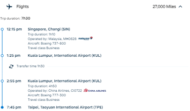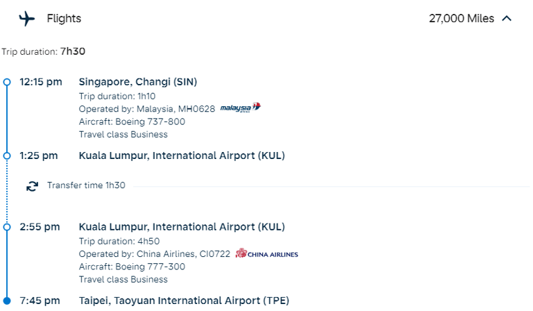 Alternatively, you can build an itinerary that allows you to travel to Taipei for 27000 miles and 130SGD, flying both Malaysia Airlines and China Airlines.