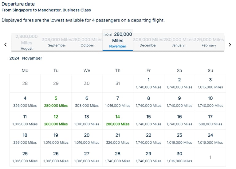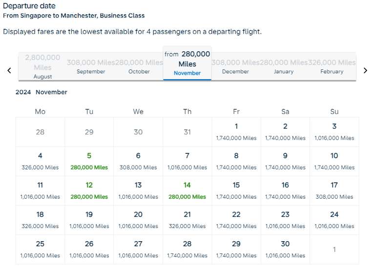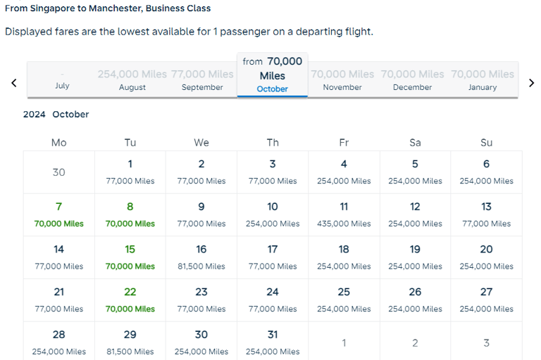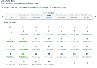 Take a Singapore to Manchester flight for example (above). For October 2024, there are 4 days where we can find a ticket for 70000 miles, and 10 days where you can get a ticket for 77000 miles. You can’t find this level of availability using other programs such as Krisflyer and Asia Miles.