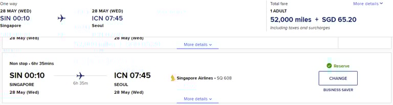 Krisflyer will set you back by 34000 miles and 65SGD instead for a direct flight.