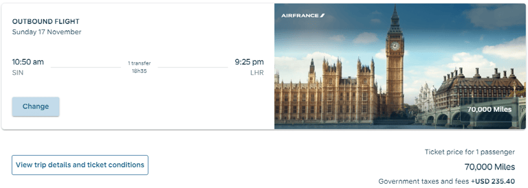 Europe is probably a Singaporean's third most favourite travel destination (after Japan, and Thailand), so having cheap award flights to Europe is a plus point. Business award flights to Europe starts from 70000 miles plus taxes and surcharges (approximately around 200USD).