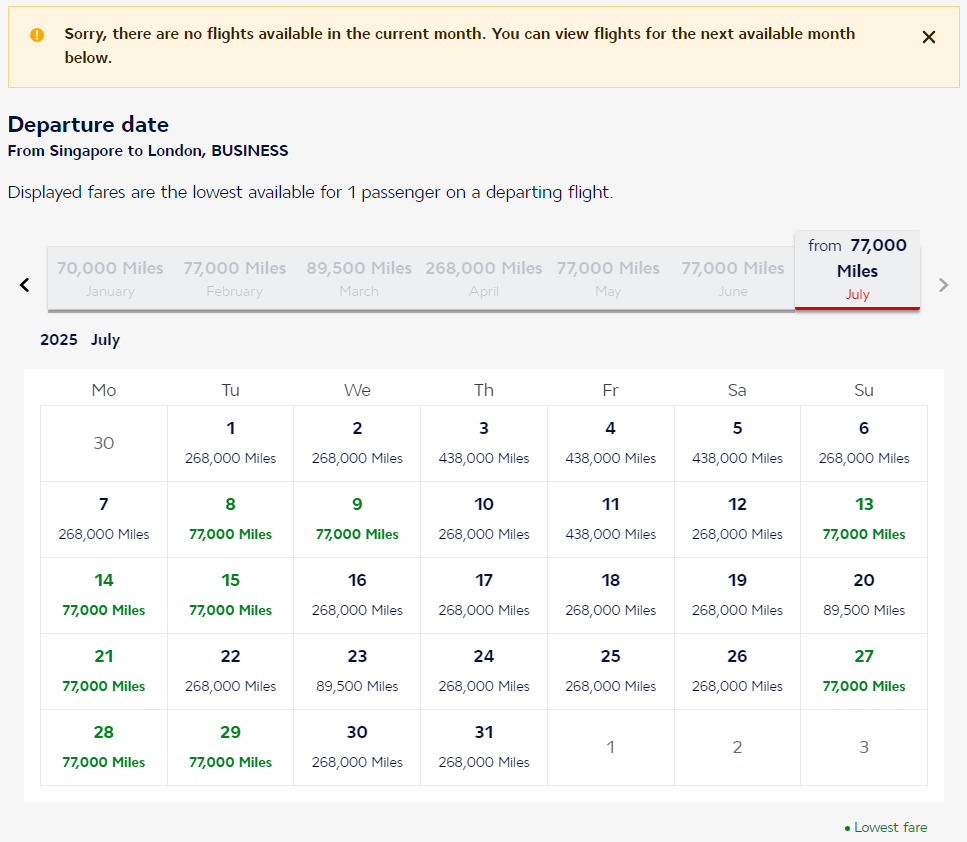 As you can see in the calendar above, there's a wealth of information being shown. The calendar tells us that the cheapest business class redemption from Singapore to London for the month of April 2025 starts from 268000 miles, but the same redemption only starts from 70000 miles on the month of January 2025. Not just that, the calendar also tells us that there are several days where we can get the same flight for 77000 miles on the month of July 2025.