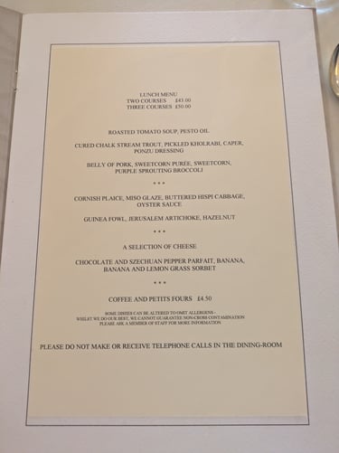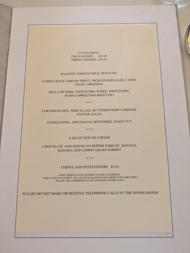 I had the set lunch, and at the time of writing, this costs 50 pounds for a three course meal. You can take a look at the menu I had below.