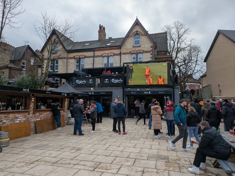 I recommend Taggy's. Taggy's is not just a pub with indoor seating, it also has a beer garden. Taggy's is just a short walk from Anfield, and the matchday atmosphere is great. Taggy's also organises LFC-themed events, such as End of Season parties, so do keep a lookout for them.
