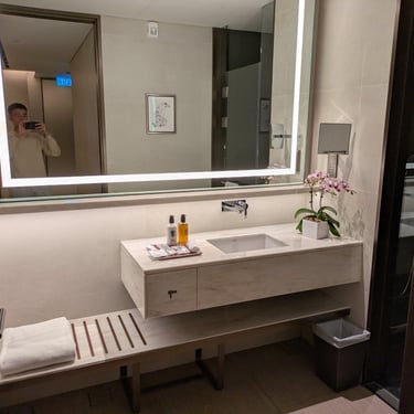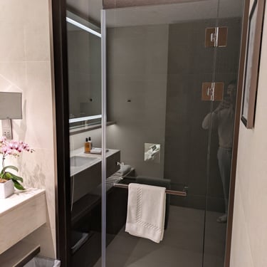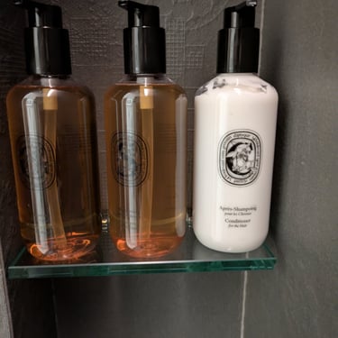 The shampoo, conditioner, and body wash were by Diptyque. I took a shower, and the water pressure was good. I also like that the toothpaste was from Colgate, instead of some imitation brands.