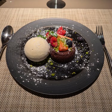 I ordered the chili king prawns, salmon and chocolate fondant. I'm very aware that this is a lounge review, not a restaurant review, but the food was excellent. Ingredients are fresh, and the chef has nailed the cook on the seafood items I ordered. The chili king prawns, and salmon were well-cooked; they were not dry, and the salmon's skin had a nice crispiness to it.