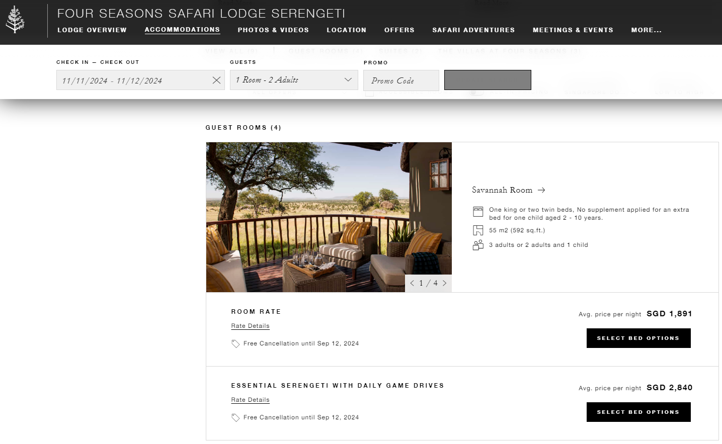 Your accommodation during the safari trip will determine how much your trip will cost. You can choose to stay in Four Seasons for about 2000SGD per night.